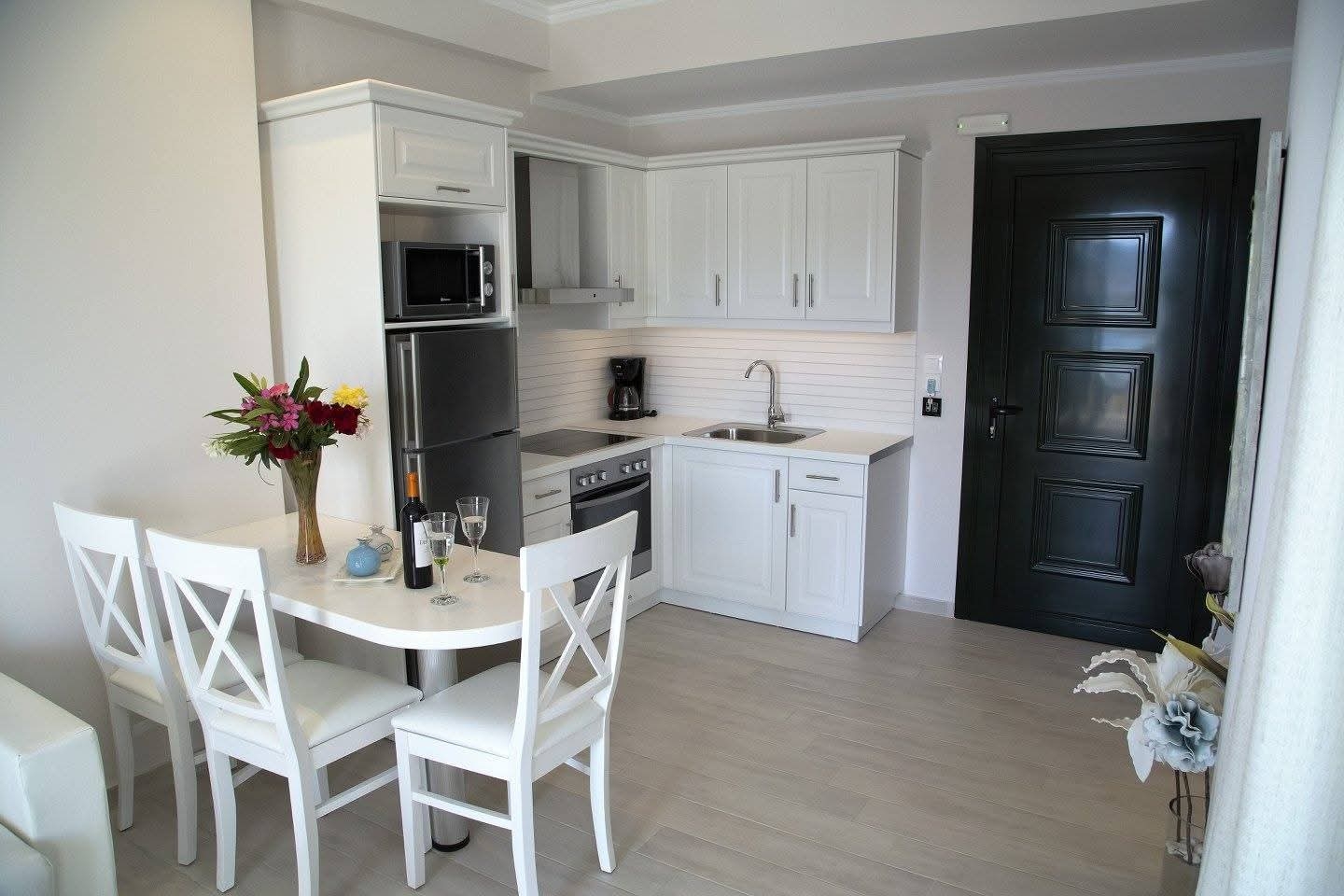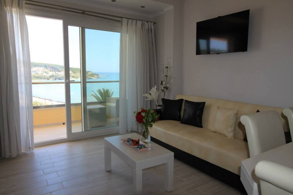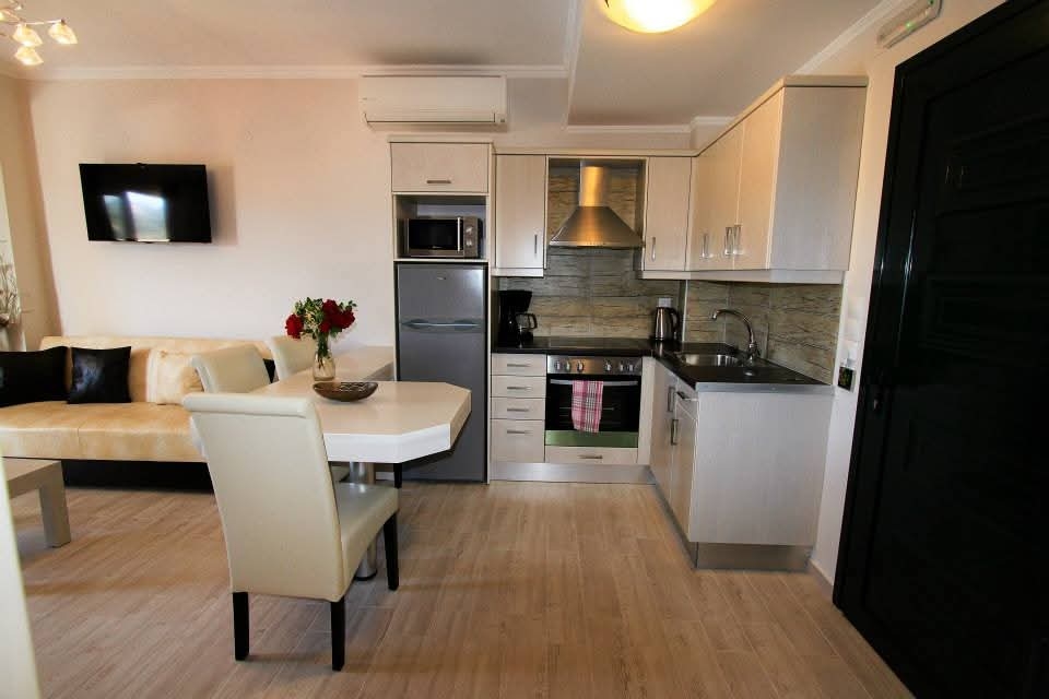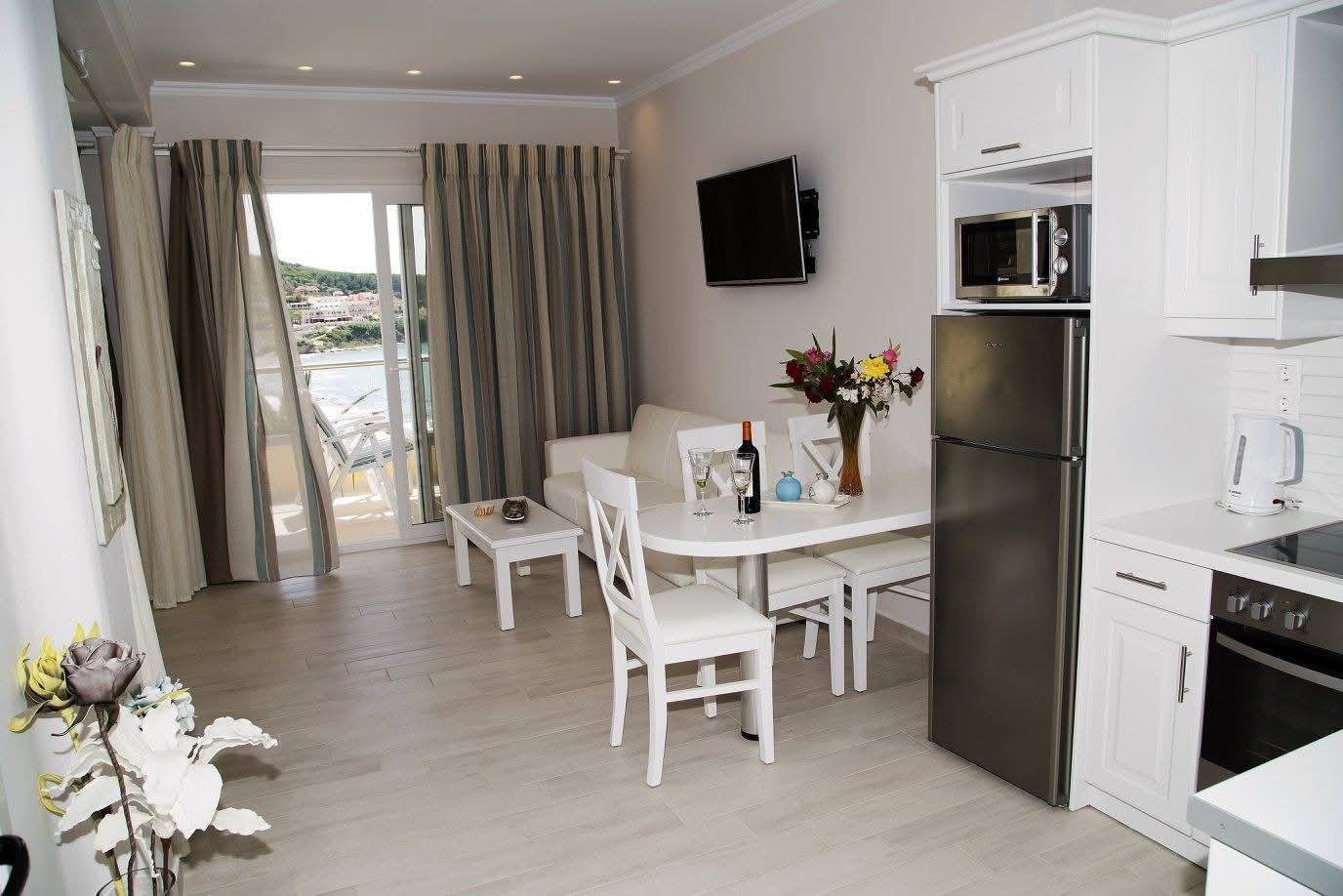 Elegant upper-floor suite featuring a bright living area, separate bedroom, and modern bathroom with walk-in shower and bathtub. The fully equipped kitchen includes a stovetop, refrigerator, oven, and kitchenware for self-catering comfort. Enjoy unobstructed sea views from your private balcony, along with premium amenities, soundproofing, and a flat-screen TV.