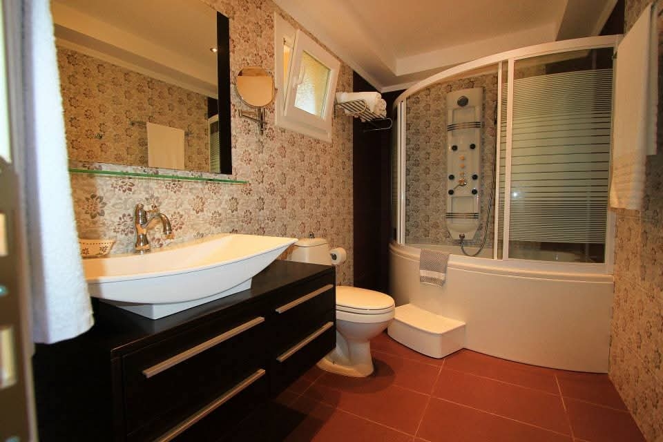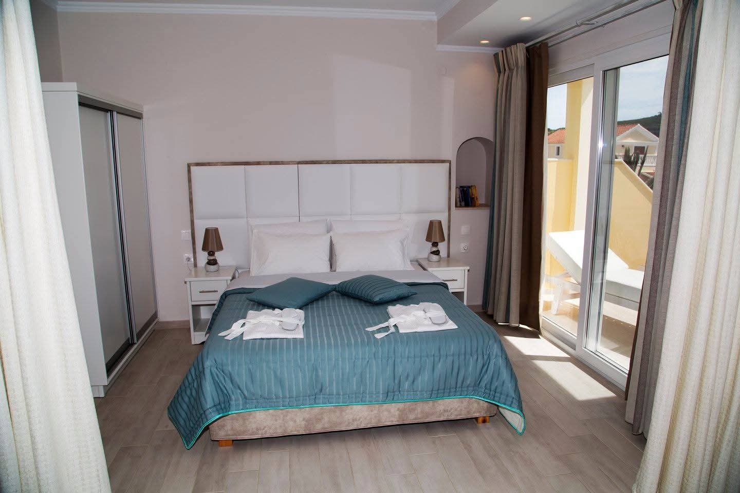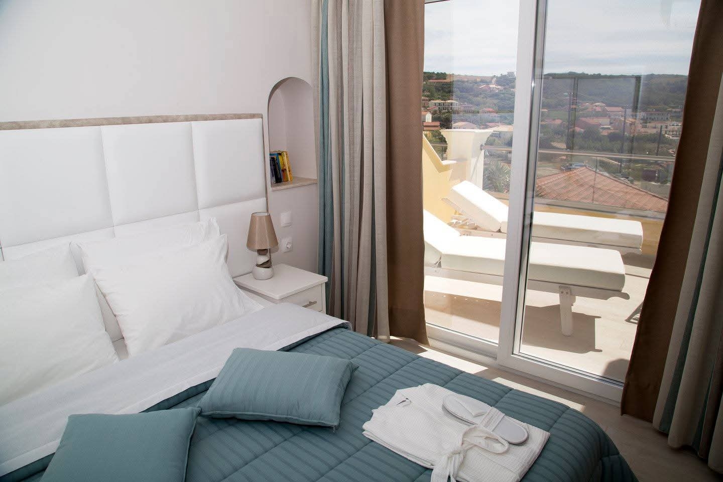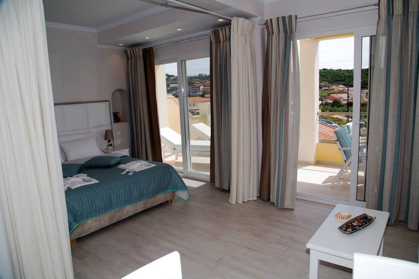 Elegant upper-floor suite featuring a bright living area, separate bedroom, and modern bathroom with walk-in shower and bathtub. The fully equipped kitchen includes a stovetop, refrigerator, oven, and kitchenware for self-catering comfort. Enjoy unobstructed sea views from your private balcony, along with premium amenities, soundproofing, and a flat-screen TV.