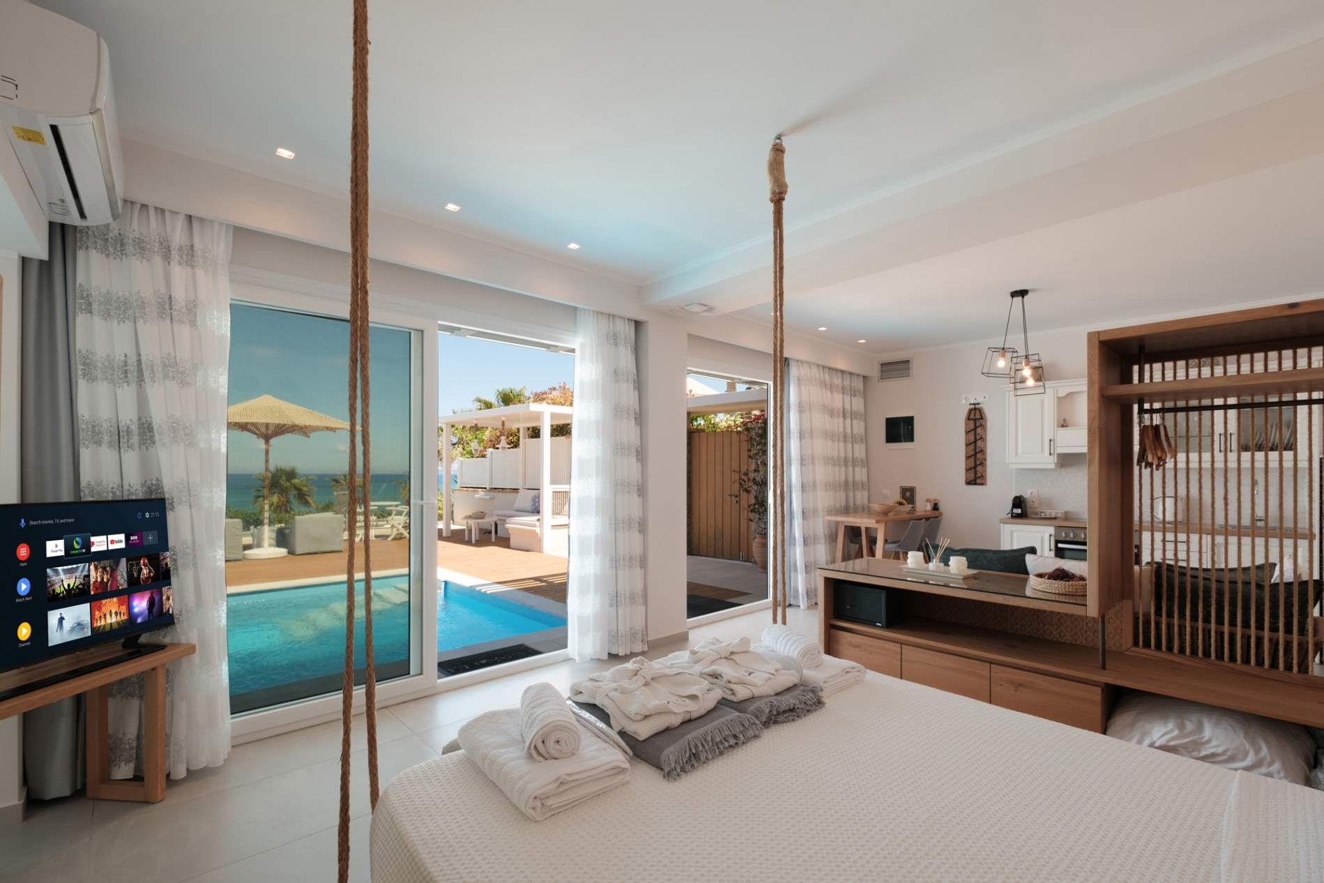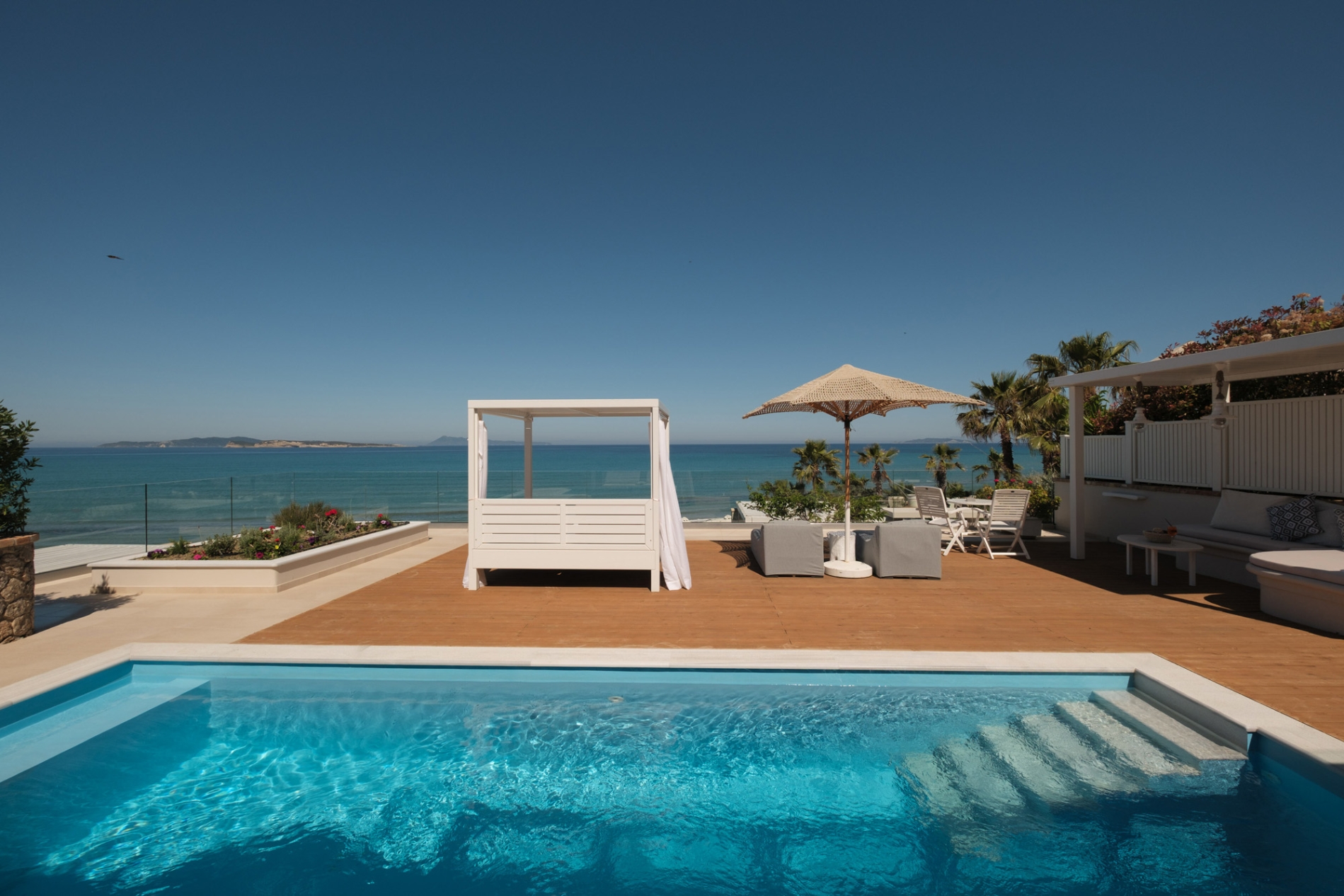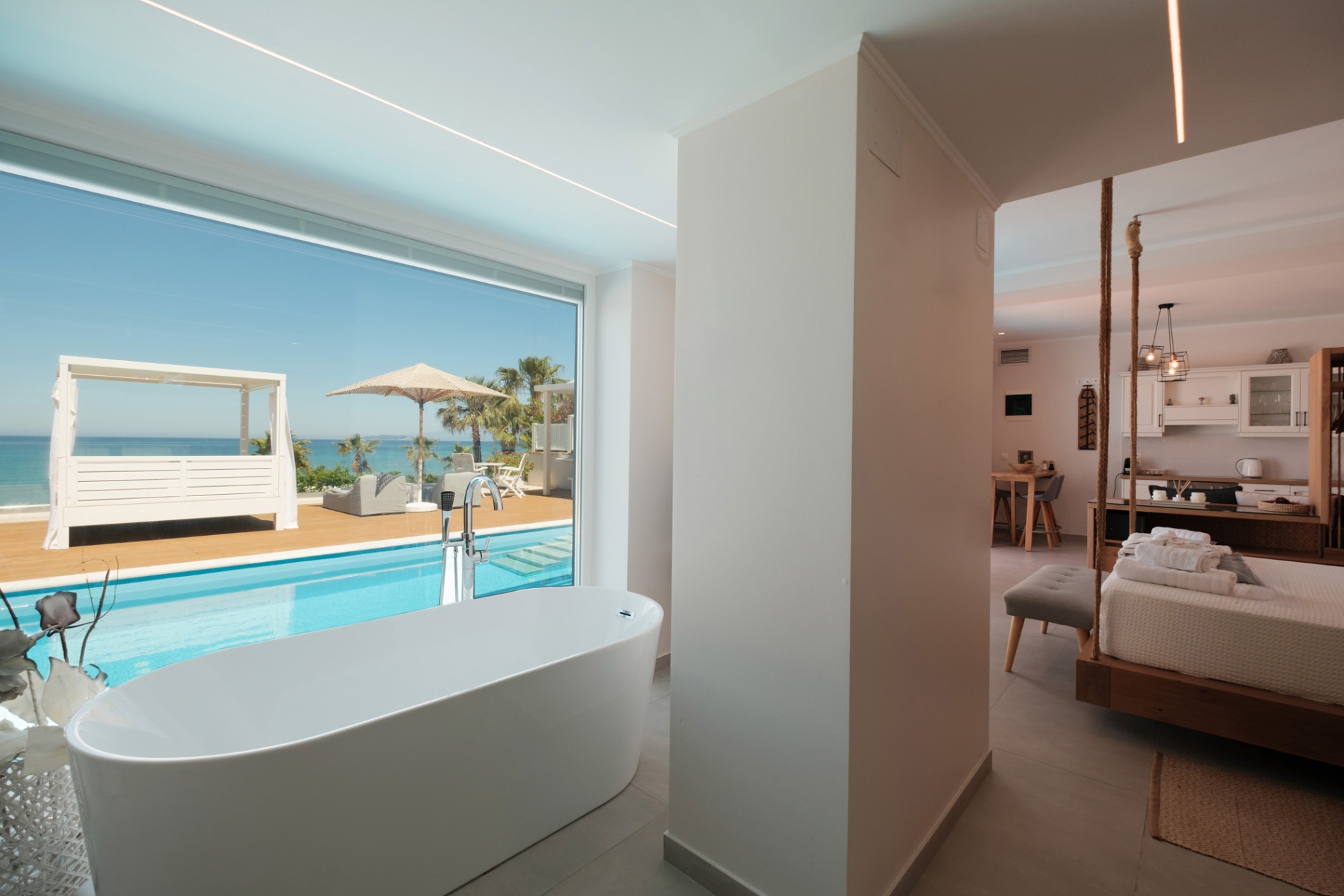 A refined beachfront residence offering a private pool and panoramic sunset views. It includes a stylish living room, a serene bedroom, and an open-plan bathroom with walk-in shower. The outdoor lounge and dining area create the perfect setting to unwind by the sea.
