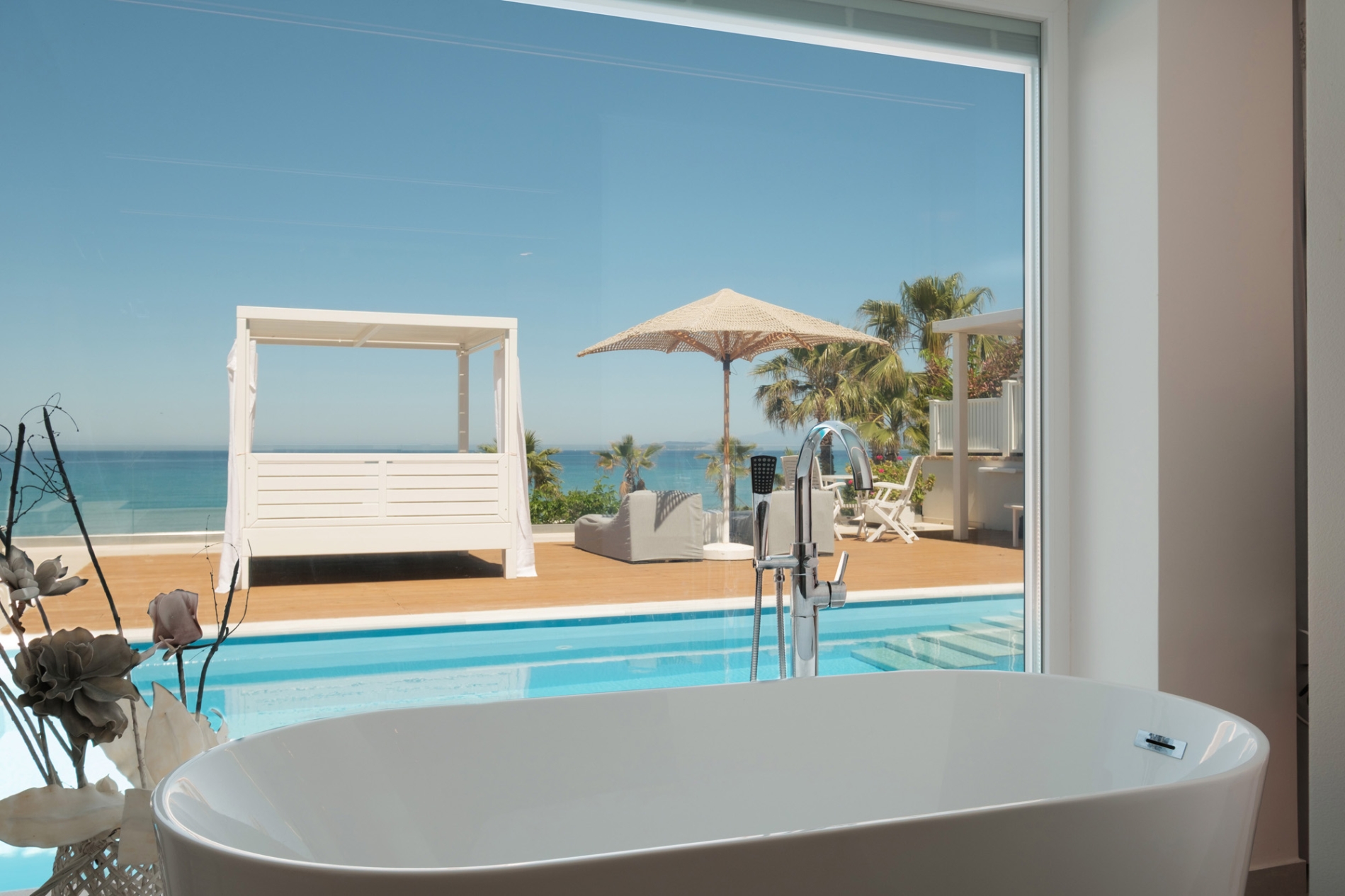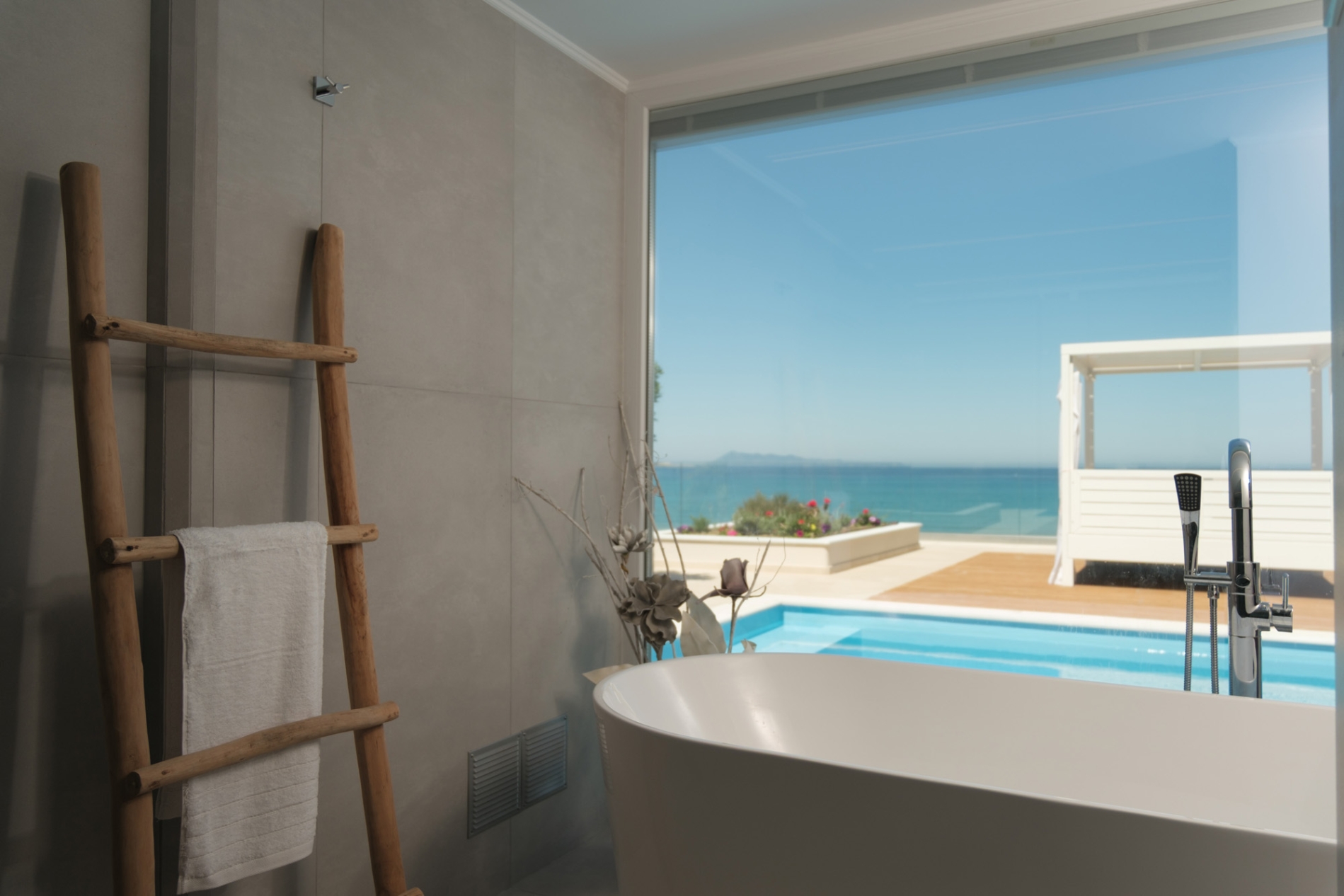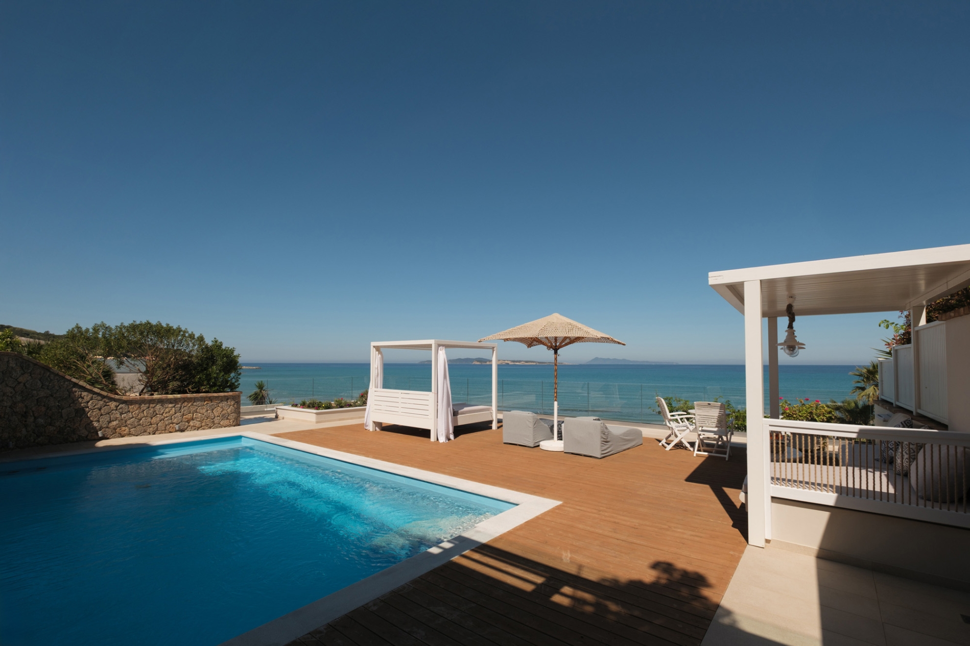 A refined beachfront residence offering a private pool and panoramic sunset views. It includes a stylish living room, a serene bedroom, and an open-plan bathroom with walk-in shower. The outdoor lounge and dining area create the perfect setting to unwind by the sea.